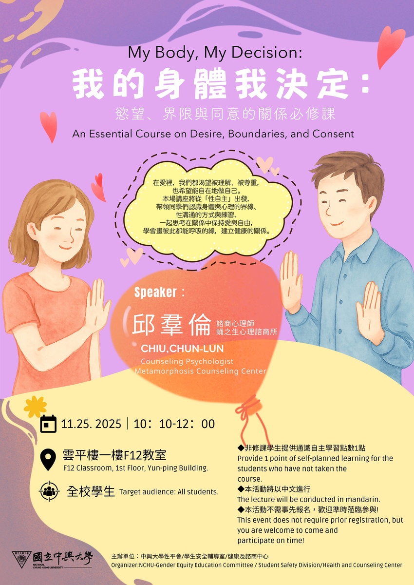 本場講座將從「性自主」出發,帶領同學們認識身體與心理的界線、性溝通的方式與練習, 一起思考在關係中保持愛與自由,學會畫彼此都能呼吸的線,建立健康的關係。