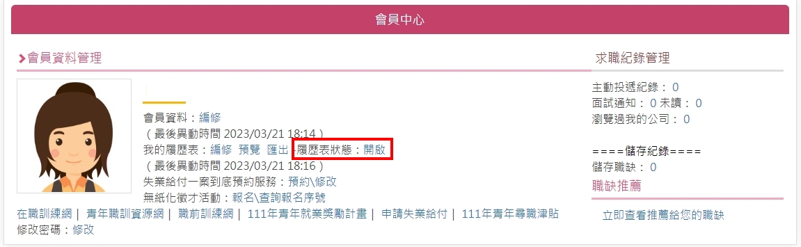 請記得開啟個人履歷:請於會員中心>履歷表狀態:開啟