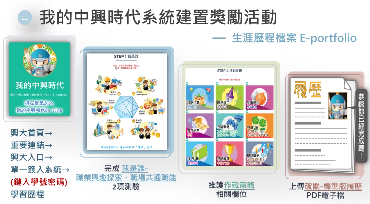 (一)協助學生熟悉「我的中興時代」生涯歷程檔案(E-portfolio)系統,記錄學習成果與職涯發展計畫。