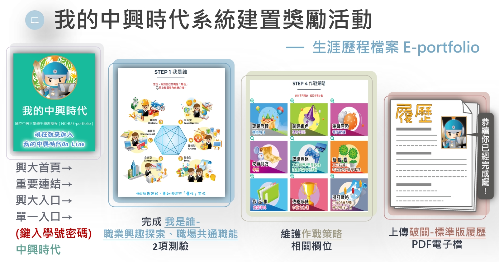 為協助學生及早進行生涯規劃,確認未來目標與方向,適性發展、成就未來人生,開發融入「生涯規劃」理念並搭載大專校院就業職能平台-UCAN測驗與紀錄學生學習歷程功能之「我的中興時代」生涯歷程檔案系統(E-portfolio),以線上遊戲模式設計,輔以幽默文字、貼心提示撰寫履歷應注意事項,利用闖關填答方式誘使學生完成個人專屬符合推甄、就業需求之學習歷程紀錄、履歷自傳。