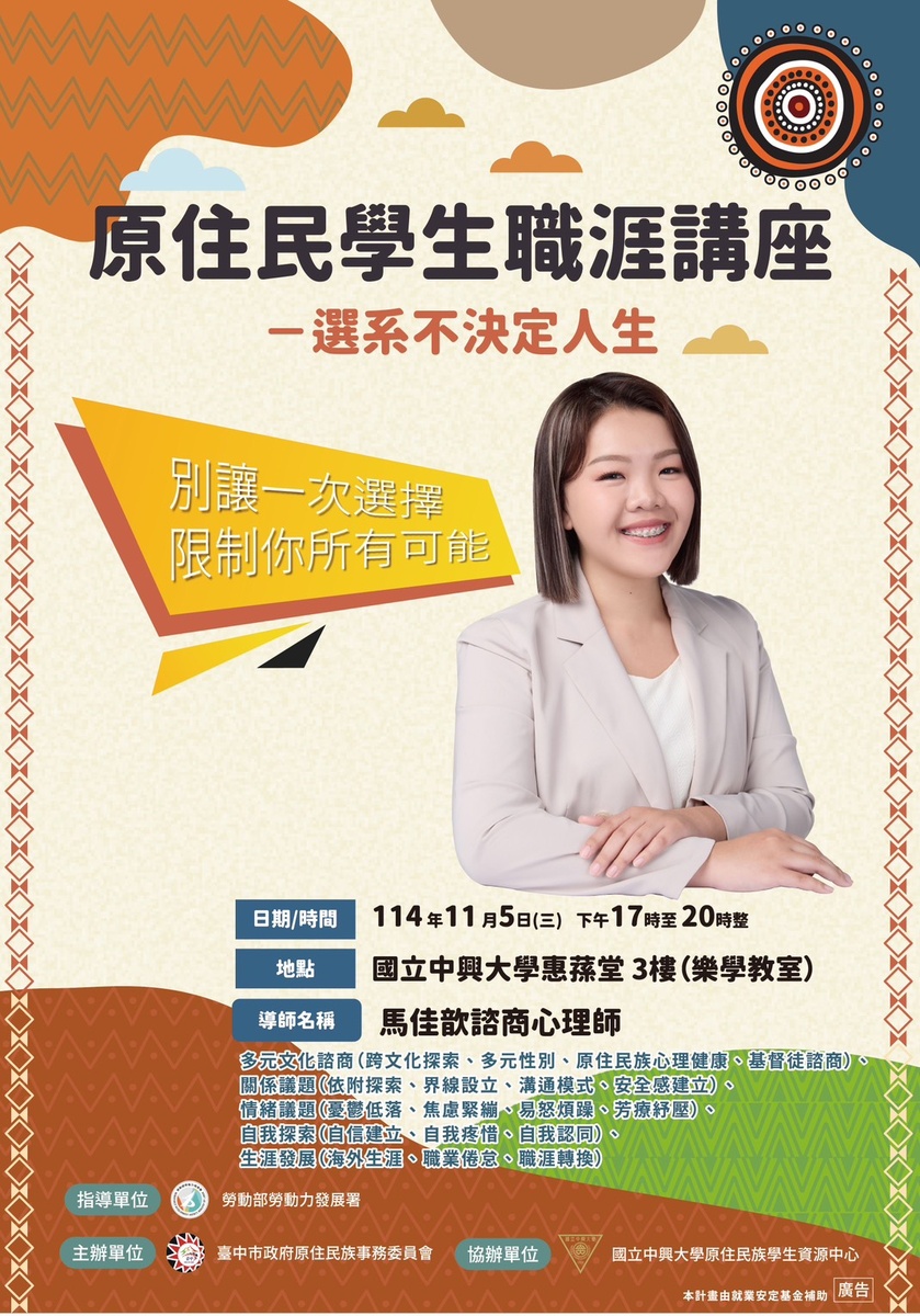 ❀ 報名後因故不能參加,請主動致電告知。( 臺中原民會04-25255398,葉就服員;興大原資中心04-22840237#26,曾助理。)