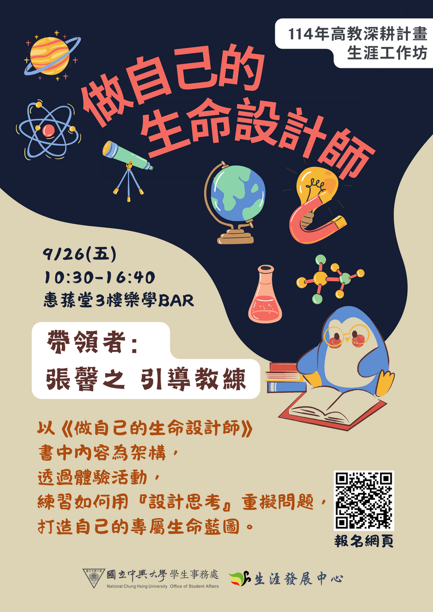 ✿本活動認列高教深耕多元職能學習輔導1場次,活動開始後10分鐘內未簽到、活動結束後未簽退暨未全程參與活動者不予認列。**主辦單位對高教深耕多元職能學習輔導場次認定保有最終修改、變更、解釋暨取消之權利。參與本活動之同時即視為同意接受此規範。114學年起申請多元職能學習輔導獎勵金之同學請自行拍攝至少一張含本人入鏡之活動照片,以證明本人親自出席。