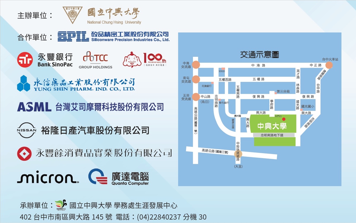 2.若有任何活動問題請洽:國立中興大學生涯發展中心李小姐04-22840237#30