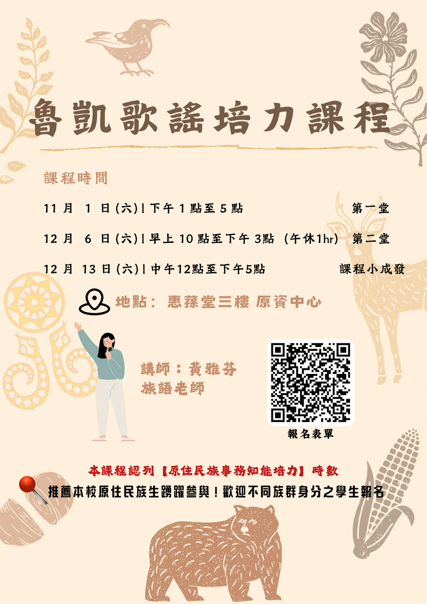 ◎ 本次活動認列高教深耕原民力 【原住民族事務知能培力】 時數,實體課程日期排定於:11/1、12/6、12/13 週六。