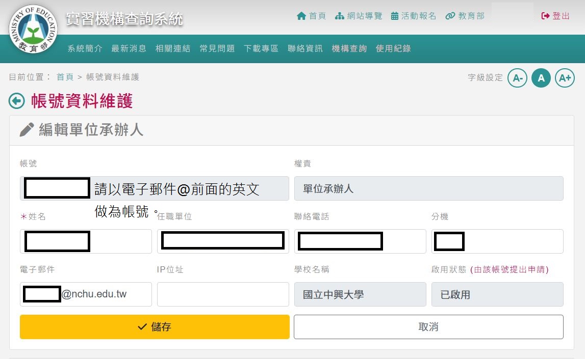 為利落實該系統之查詢功能,請本校教學單位有負責校外實習之系所承辦人填寫表單,以利設定權限給予各承辦人,於學生實習前進行實習機構查詢;並落實實習檢核、媒合與評估事宜。