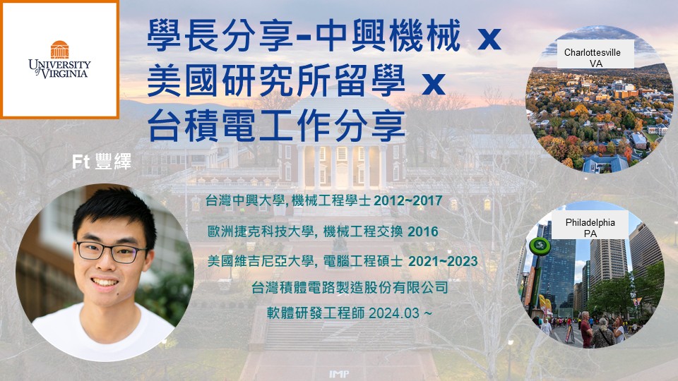 (中興大學機械工程學士 / 美國維吉尼亞大學電腦工程碩士/ 台積電工程師 University of Virginia, Master in Computer Engineering Program / UVA Link Lab Software Engineer)