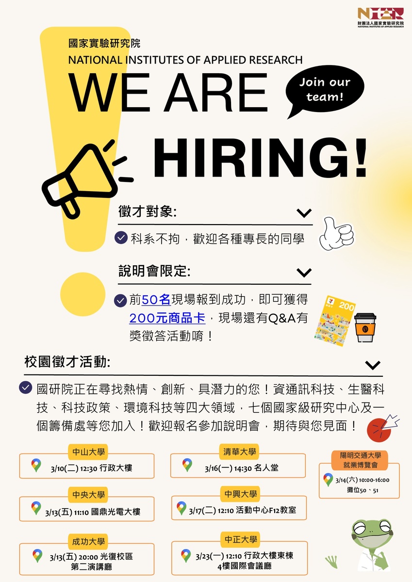 - 本活動認列高教深耕就業力-多元職能學習輔導1場次(50分鐘),活動開始前20分鐘為簽到時間,未於簽到時間完成簽到、活動結束後未簽退暨未全程參與活動者不予認列。113 年 09 月 04 日第 465 次行政會議修正,企業說明會每學期至多認列 2 場次。114學年起申請多元職能學習輔導獎勵金之同學請自行拍攝至少一張含本人入鏡之活動照片,以證明本人親自出席。依國立中興大學提升高教公共性就學協助獎勵辦法第五條,當年度經費用罄時,將不再受理申請及補助。主辦單位對多元職能學習輔導場次認定保有最終修改、變更、解釋暨取消之權利。參與本活動之同時即視為同意接受此規範。