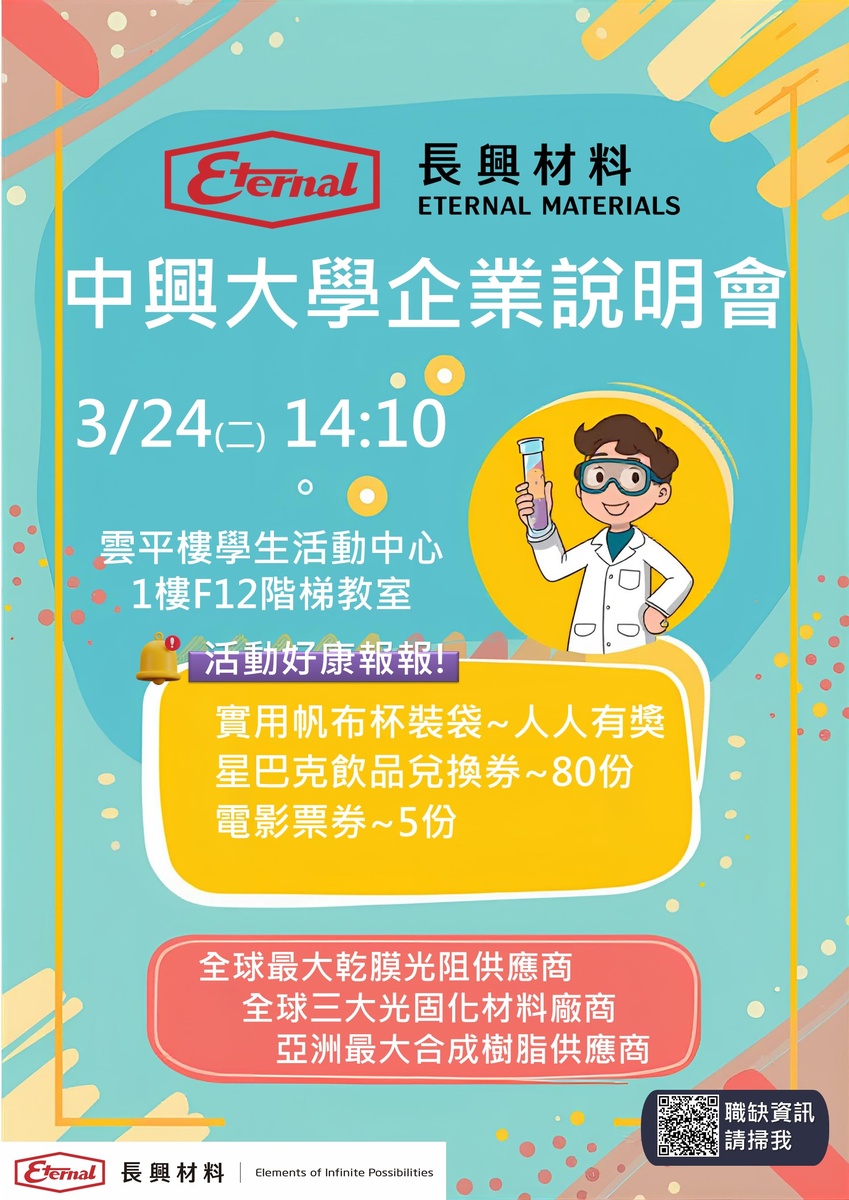 歡迎您3/24 14:10到 雲平樓學生活動中心1樓F12階梯教室 參加 長興材料徵才說明會