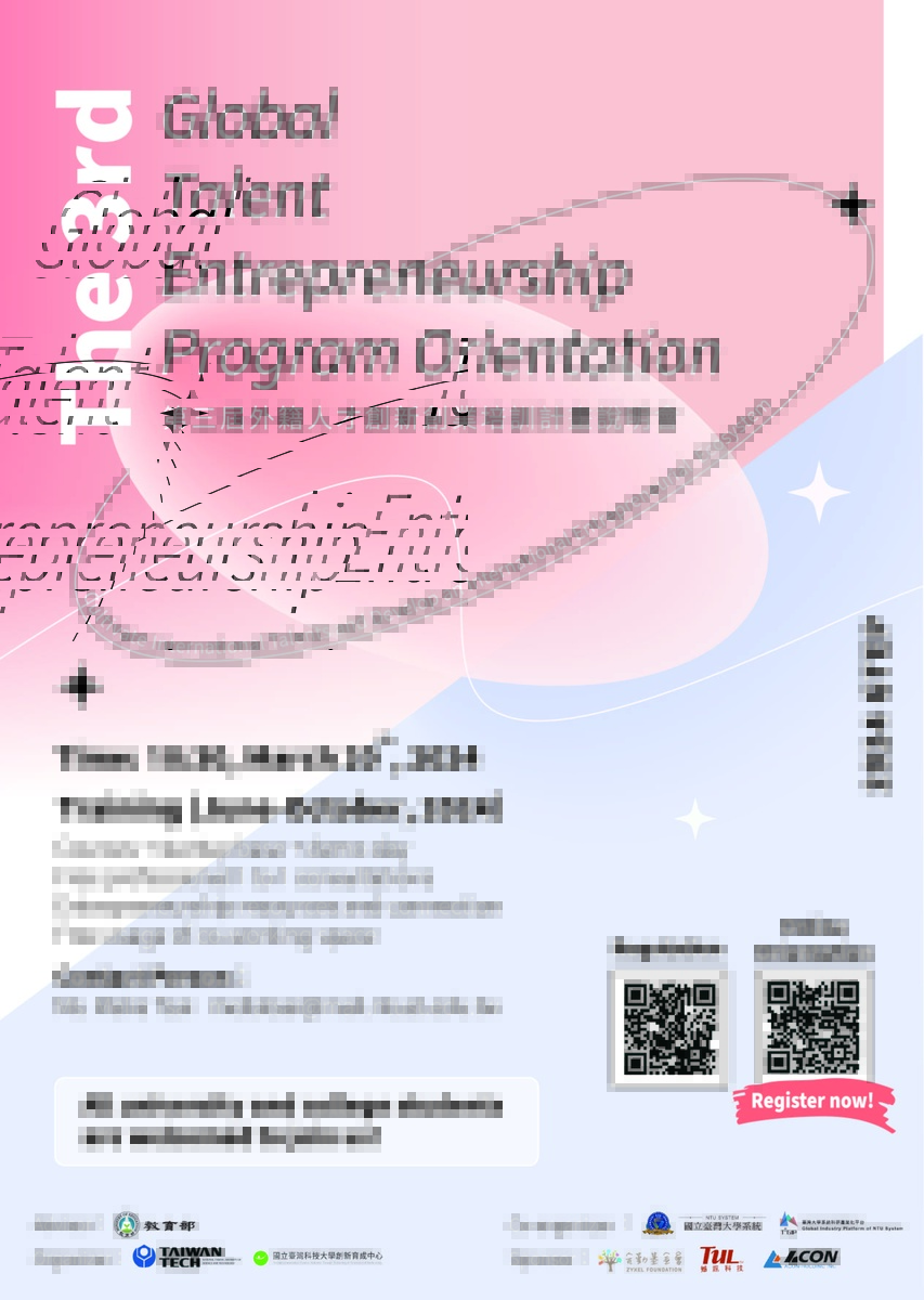 一、為激勵在台外籍生,培養創新創業知能,本校將於113年3月20日(三)舉辦旨揭計畫線上說明會。