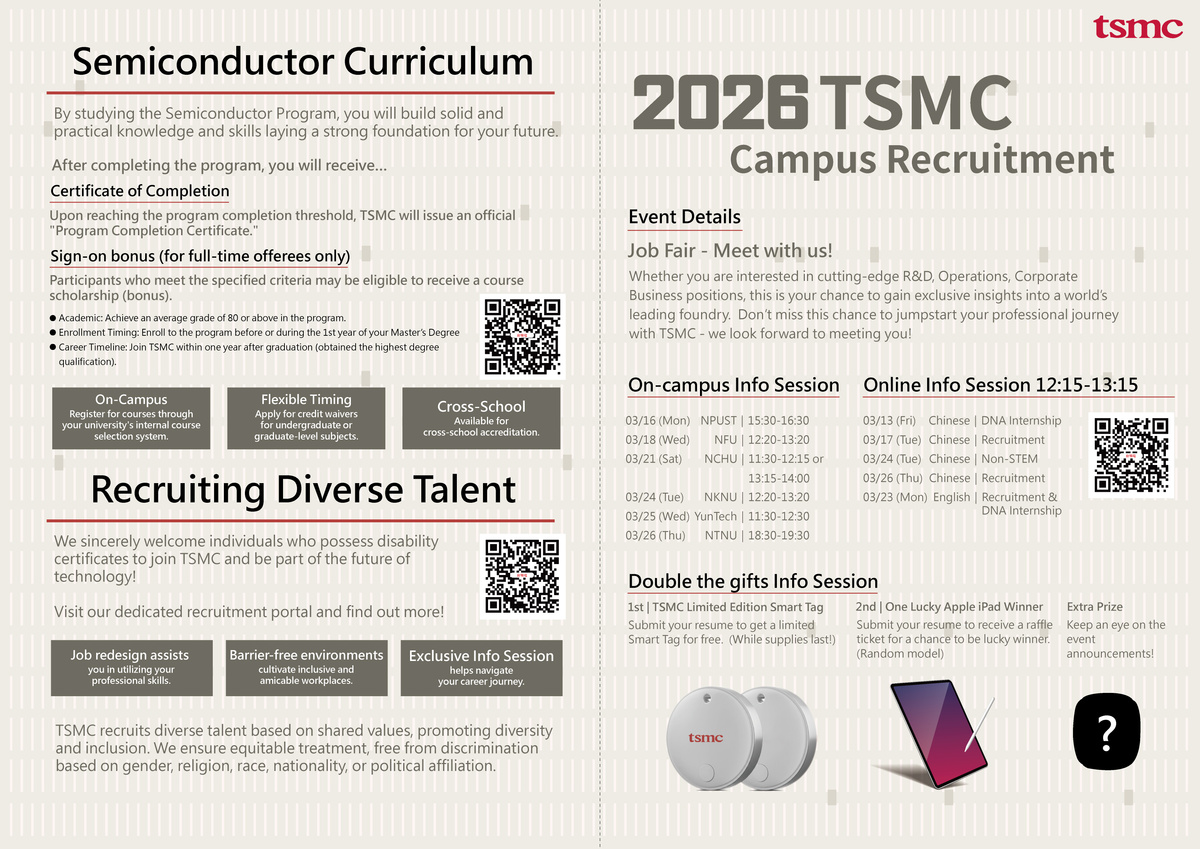 * 就業博覽會: 歡迎親臨現場,與台積學長姐及HR面對面交流!深入了解不同科系在台積電的職務內容、工作型態、學習應用與職涯發展。現場完成履歷有機會抽好禮!