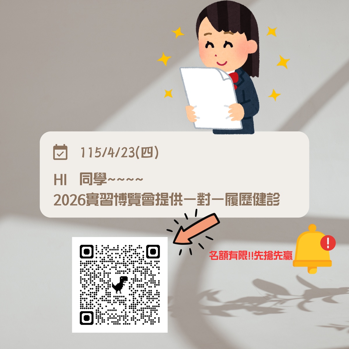 - 當天一對一履歷健診諮詢(https://forms.gle/gtkZE3DV1RHAr67AA),歡迎同學報名!