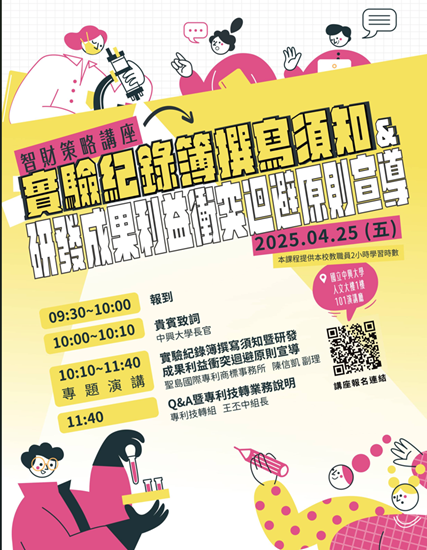 【活動轉知】歡迎報名「智財策略講座-實驗紀錄簿撰寫須知暨研發成果利益衝突迴避原則宣導」【Event Notification】Welcome to Register for the "Intellectual Property Strategy Seminar – Guidelines for Writing Laboratory Notebooks and Principles for Avoiding Conflicts of Interest in R&D Achievements