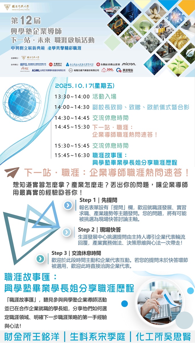 3.若有任何活動問題請洽:國立中興大學生涯發展中心李小姐04-22840237#30