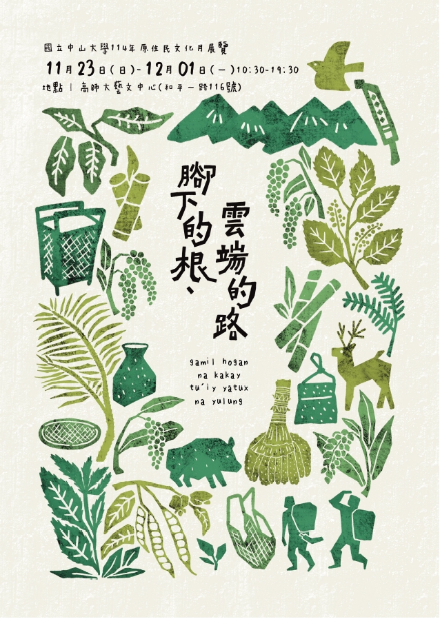 【轉知】國立中山大學原資中心辦理114年原住民文化月展覽──「腳下的根、雲端的路(gamil hogan na kakay tu'iy yatux na yulung)」