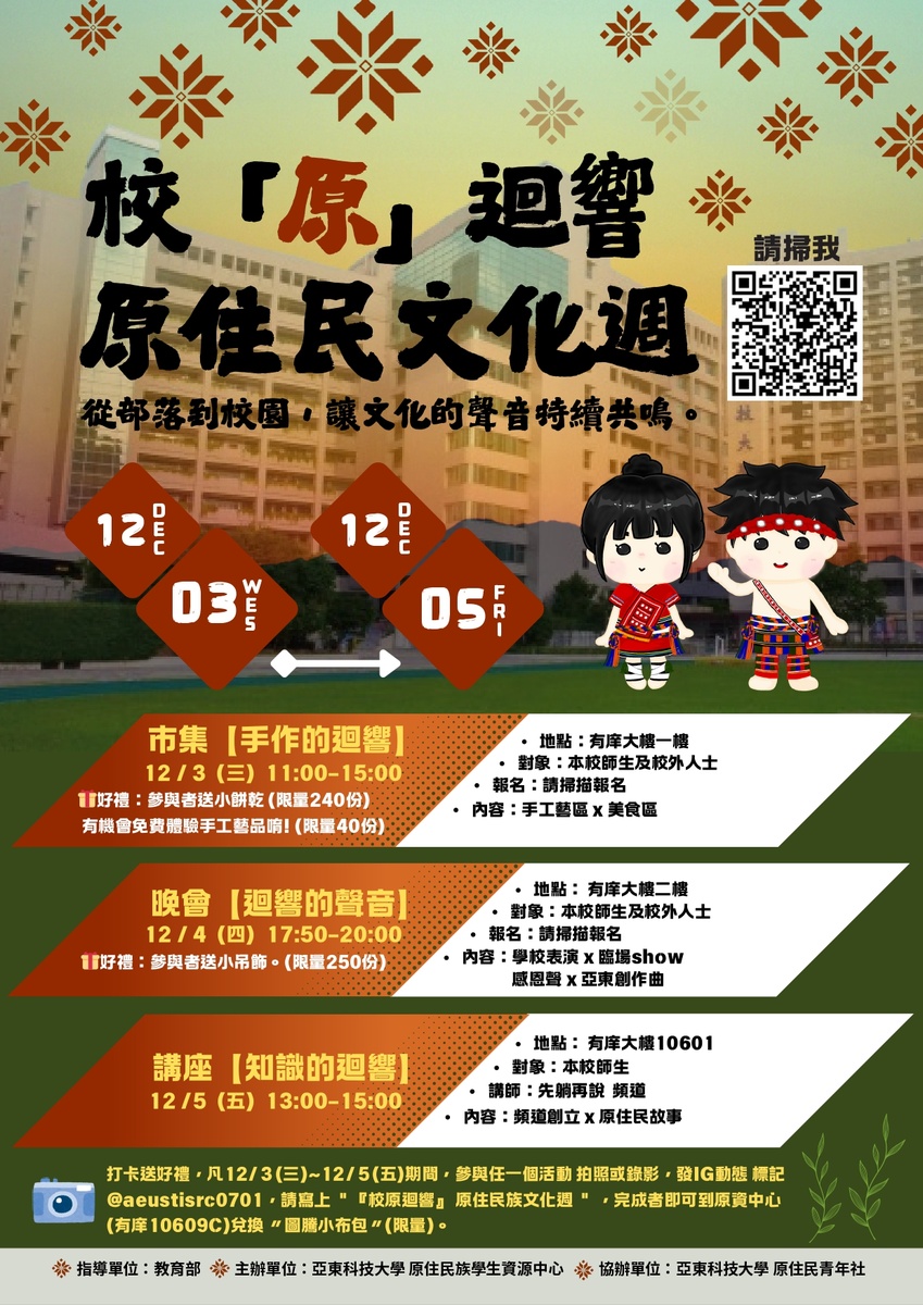 一、活動目的:一年一度的「原住民族文化週」再次來臨!希望藉由市集、原住民之夜、文化講座等一系列的活動,讓文化的聲音持續迴響,在每個故事中,聽見文化的力量那是來自土地的聲音,也是我們心中的迴響,進而推動全校師生一起認識並看見感受您所不知的台灣原住民之美。