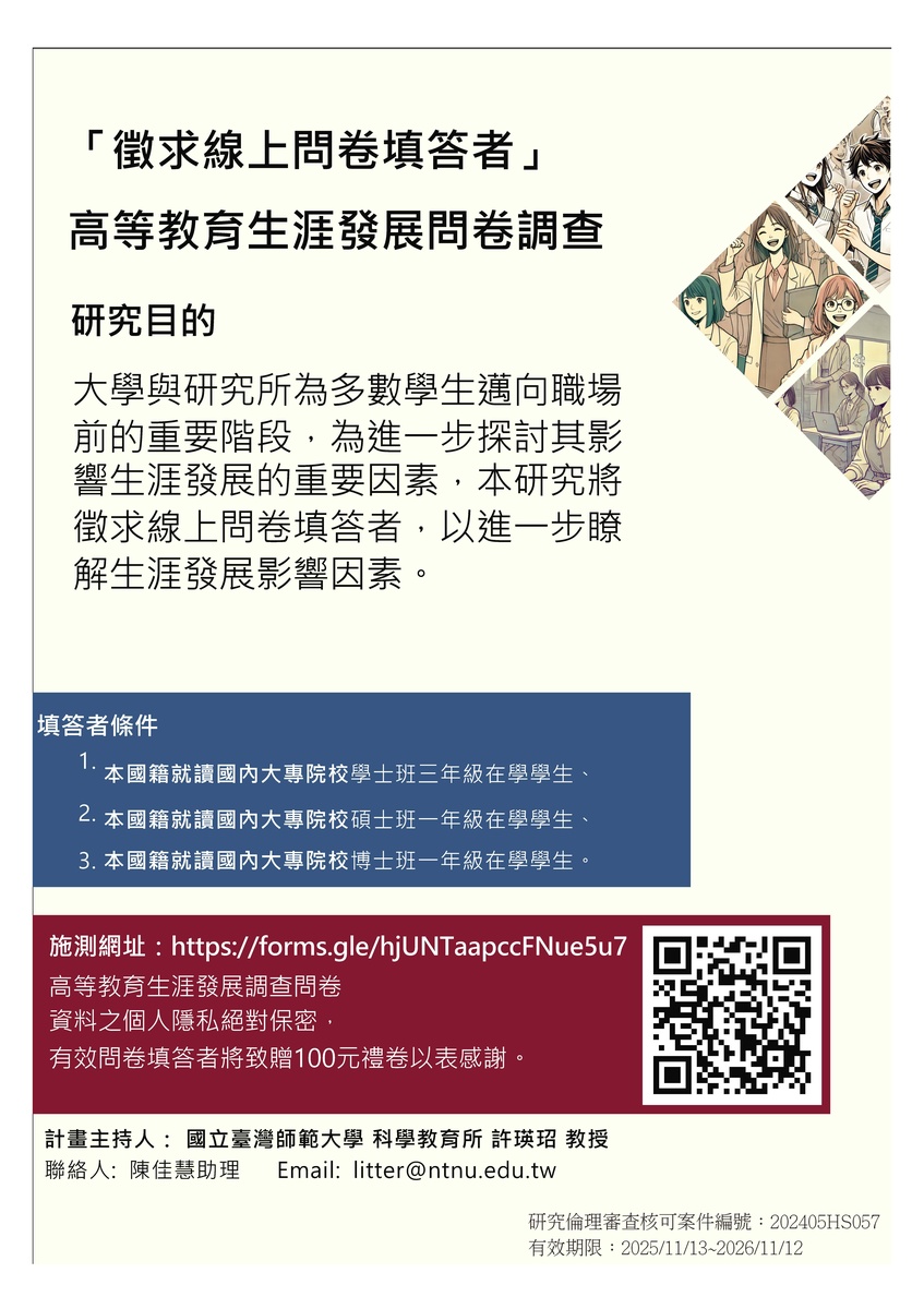 I. Professor Hsiu Ying-Shao from the Department of Science Education at our university is conducting a research project funded by the National Science and Technology Council, titled "Longitudinal Survey on Factors Influencing Career Development of Talent in STEM-Related Fields: A Study on Gender Differences." The purpose of this study is to explore the factors and their interrelationships that influence career development during the higher education stage. The research targets third-year undergraduate students, first-year master is students, and first-year doctoral students from domestic universities and colleges across all disciplines, including both STEM and non-STEM fields.