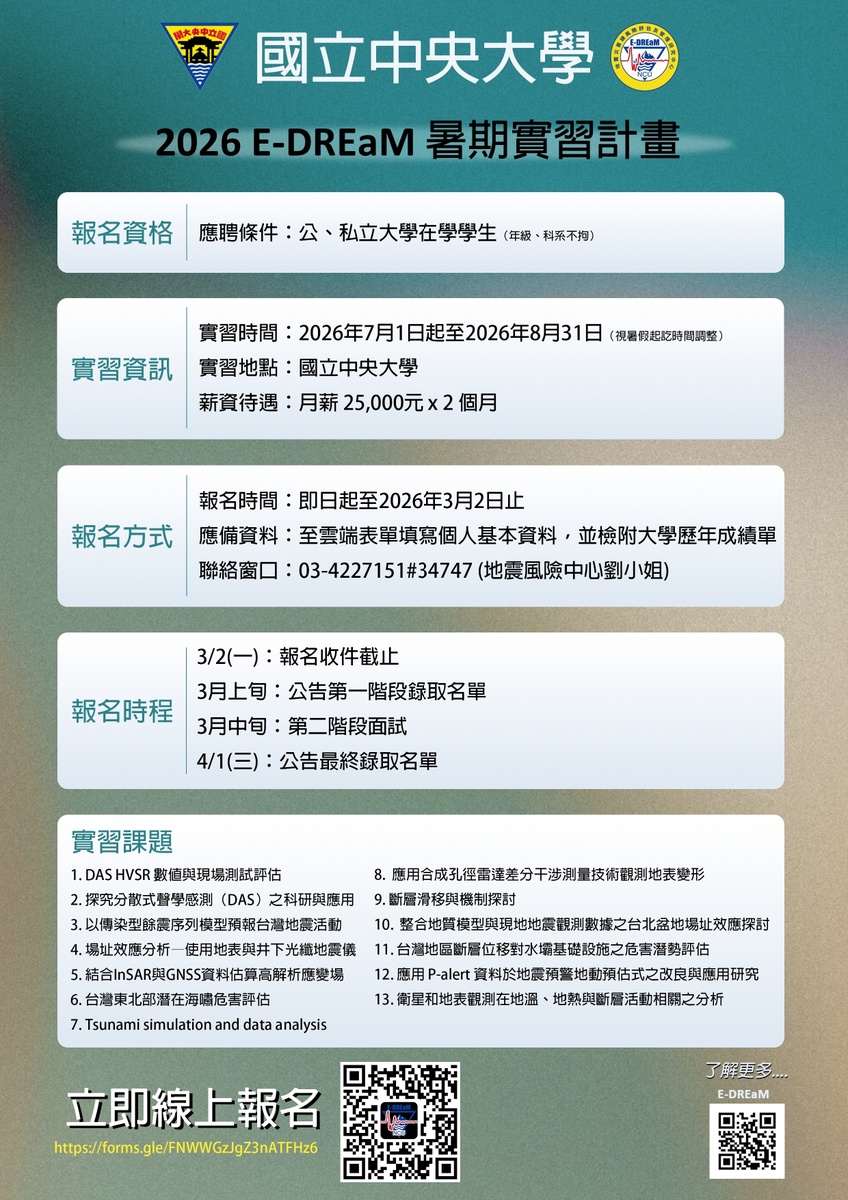 主旨:檢送國立中央大學地震災害鏈風險評估及管理研究中心辦理「2026 E-DREaM大學生暑期實習計畫」宣傳海報及報名簡章,敬請惠予轉知貴屬學生周知,請查照。