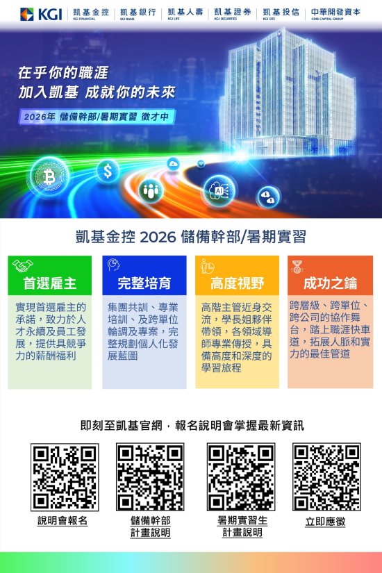 凱基金控與旗下子公司凱基銀行、凱基證券、凱基人壽及中華開發資本已啟動2026年儲備幹部與暑期實習的招募計畫。