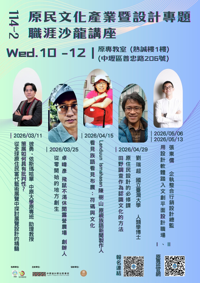 三、講座地點:本校熱誠樓1樓設計學士原住民專班辦公室(桃園市中壢區普忠路206號1樓)。