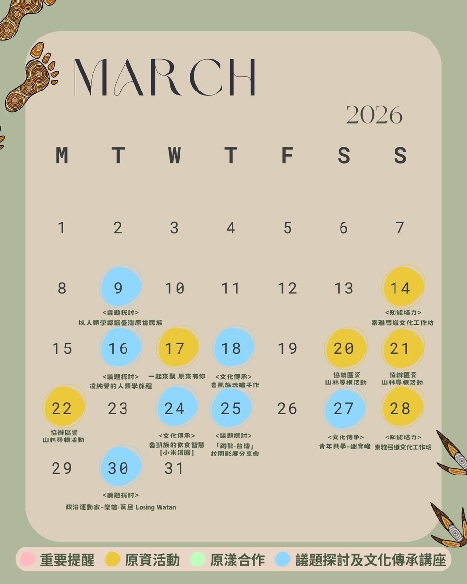 3/14、3/28、4/18 【培力系列】泰雅弓織文化工作坊 3/17 【一起來聚,原來有你】共食共學計畫 3/18 【文化工坊系列】魯凱族珠繡手作 3/20-3/22 區資山林尋根活動 3/24 部落飲食文化(小米湯圓) 2 3/25 2026「蹲點‧台灣」校園影展分享會 (原資協辦) 3/27 青年共學-謝寶峰 3/30 通識課程講座-政治運動家樂信‧瓦旦 Losing Watan