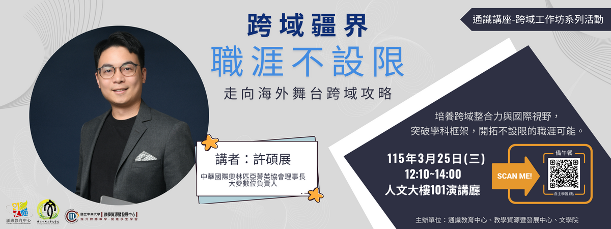 本活動由通識教育中心 × 教學資源暨發展中心 × 文學院共同舉辦的跨域講座,期待陪你從大學開始,建立更開放的學習與職涯想像。