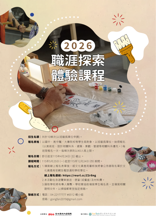文化部文化資產局辦理文資傳匠工坊「2026職涯探索體驗課程」The Ministry of Culture is organizing the "2026 Career Exploration and Experience Course" for the Cultural Heritage Inheritance Workshop.