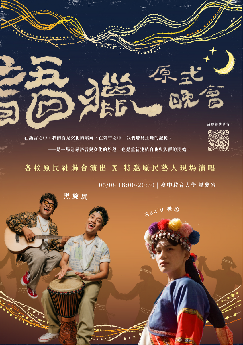(四)原式晚會演出陣容: 邀請藝人黑旋風、Naa'u娜塢,以及本校原汁原味社、中科大Laaljis拉阿利斯社、弘光科大原住民文化推廣社、南華大學原住民文化青年社共同展演。
