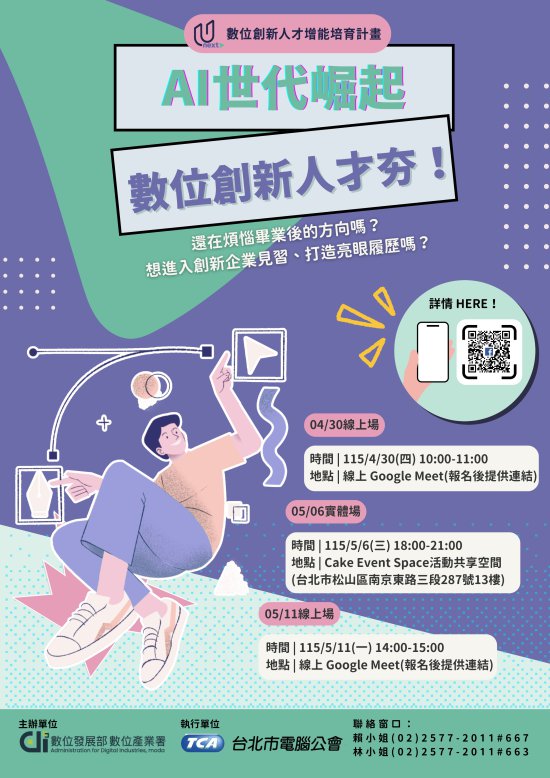 主旨:台北市電腦商業同業公會「數位創新人才增能培育計畫」自 115 年 4 月 30 日起受理見習生申請,並辦理大專校院說明會及工作坊活動,敬請惠予公告並鼓勵學生踴躍參與,請查照。
