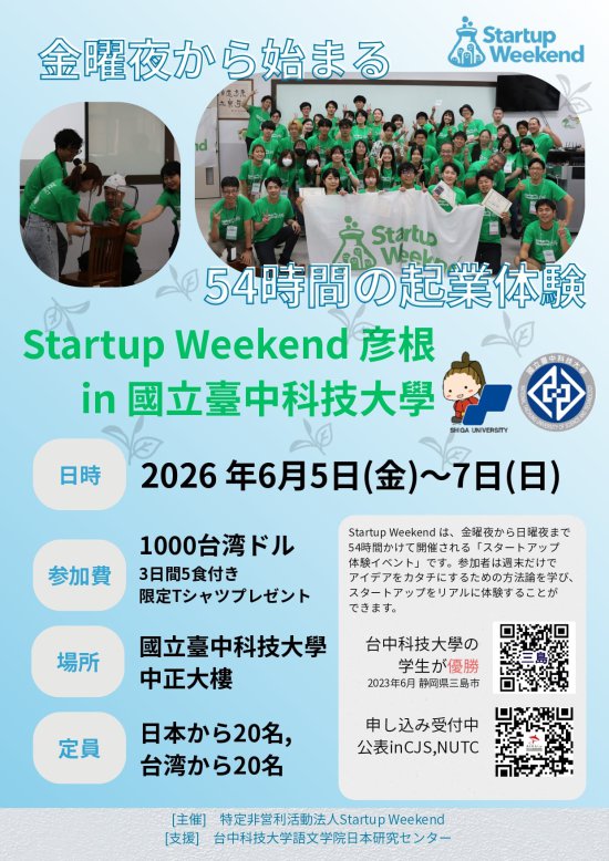 國立臺中科技大學日本研究中心訂於115年6月5日至7日舉辦「Startup Weekend 彦根 in 國立臺中科技大學」活動**National Taichung University of Science and Technology, Japan Research Center — “Startup Weekend Hikone at NTUST” (June 5–7, 2026)**