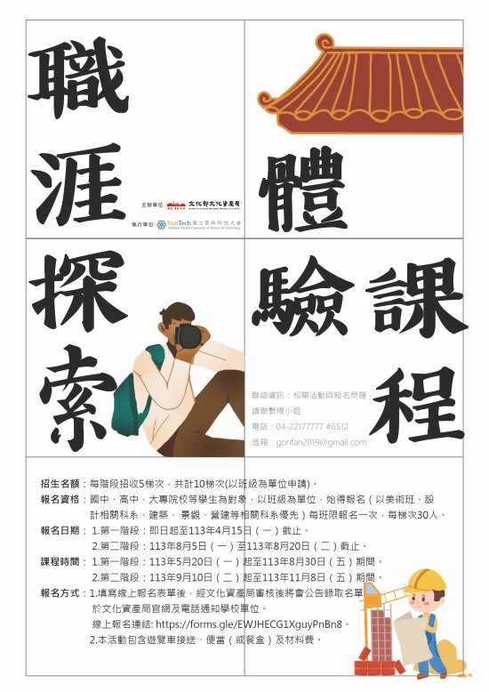 文化部文化資產局辦理文資傳匠工坊「2024職涯探索體驗課程」歡迎報名參加!The Bureau of Cultural Heritage, Ministry of Culture, is organizing the 「2024 Career Exploration Experience Course」 as part of the Cultural Heritage Craftsmanship Workshop. Welcome to register and participate!