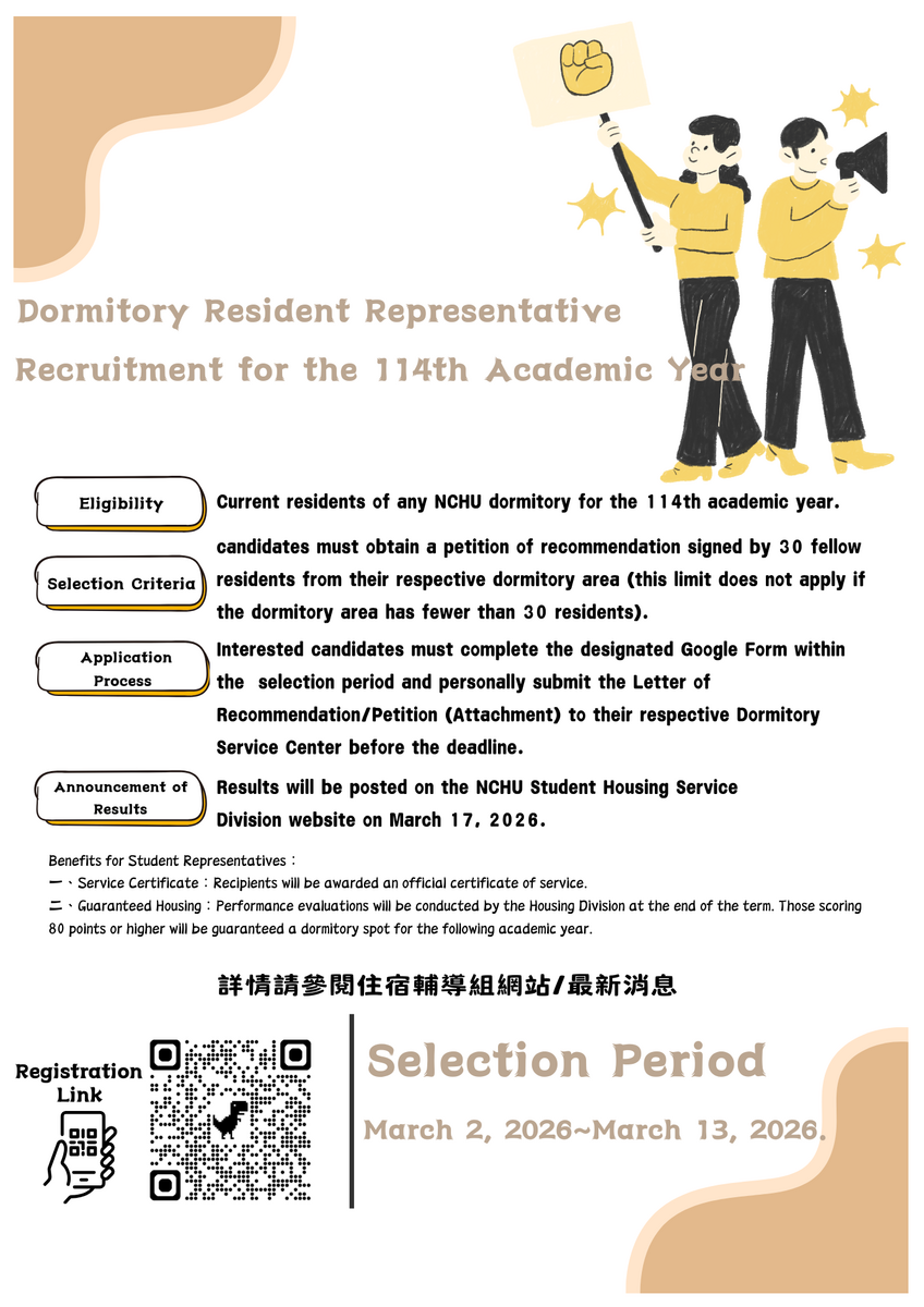 114學年度住宿生代表公開徵選 Resident Representative Recruitment for the 114th Academic Year