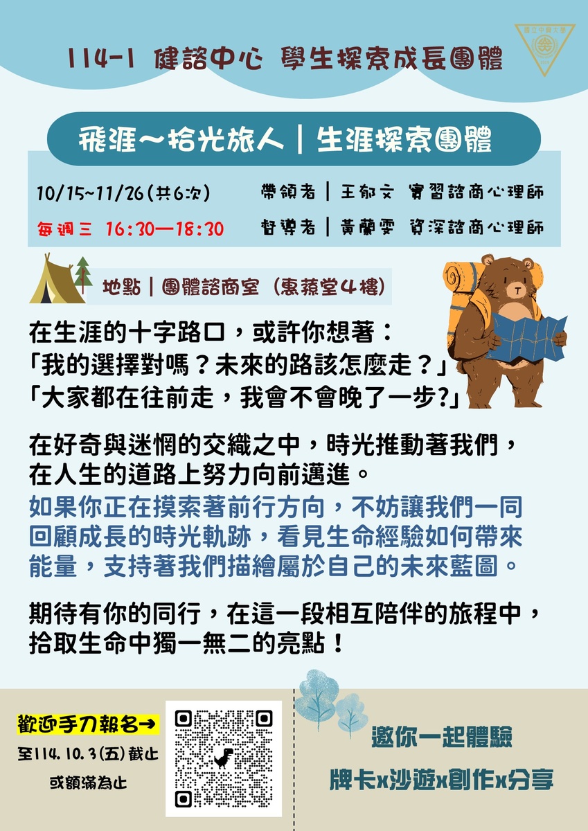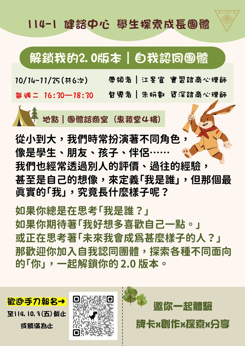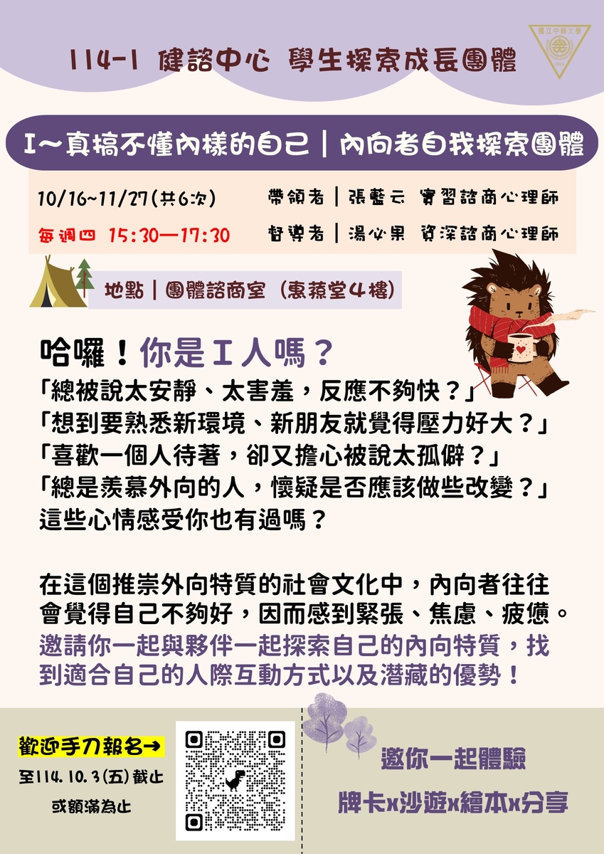 健諮中心本學期推出三個自我探索及成長團體,主題如下: