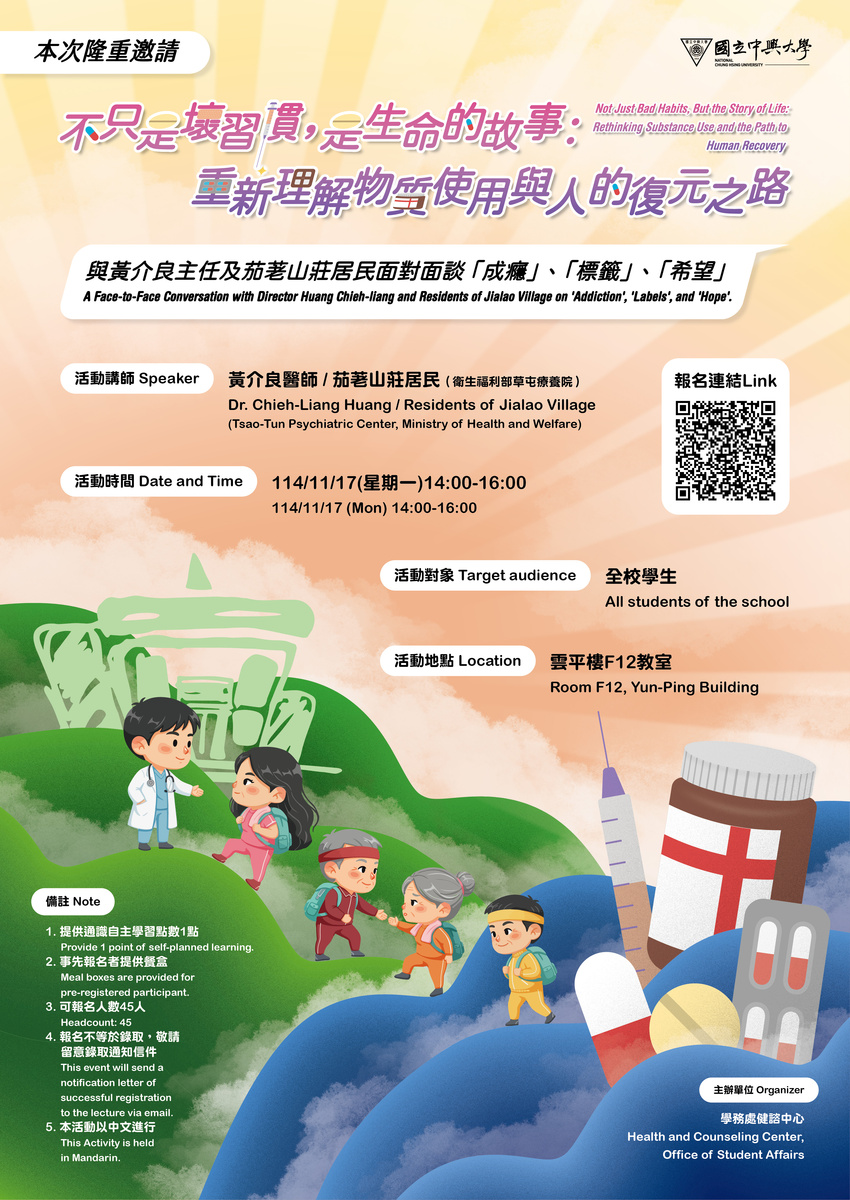 ➤活動名稱Course:《不只是壞習慣,是生命的故事:重新理解物質使用與人的復原之路》:與黃介良主任及茄荖山莊居民面對面談「成癮」、「標籤」、「希望」"Not Just Bad Habits, But the Story of Life: Rethinking Substance Use and the Path to Human Recovery":A Face-to-Face Conversation with Director Huang Chieh-liang and Residents of Jialao Village on 'Addiction', 'Labels', and 'Hope'.