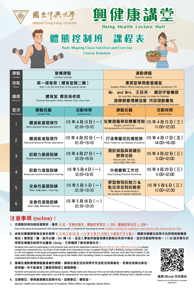 *[興健康講堂]體態控制班即將要開課囉~欲參加課程者在報名期間(115年3月23日~115年3月27日早上9點到下午5點),請親洽健康及諮商中心郭雅娟 營養師報名,名額有限,報完為止。