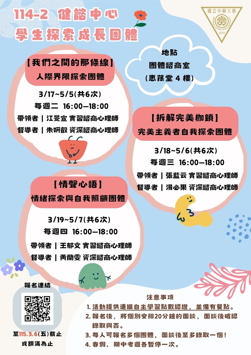 健諮中心本學期推出三個自我探索及成長團體,主題如下: