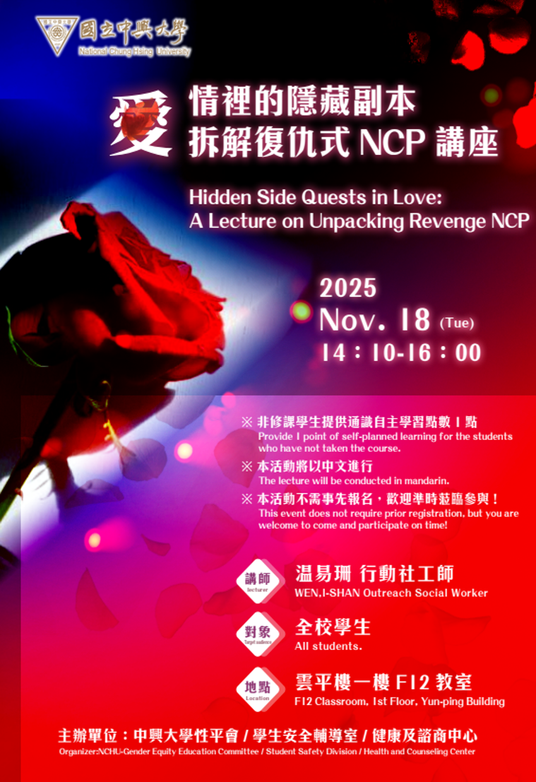 本講座溫易珊行動社工師將帶領同學辨識情感關係中的控制、勒索與暴力,並學習在關係中的自我保護與設立界線。